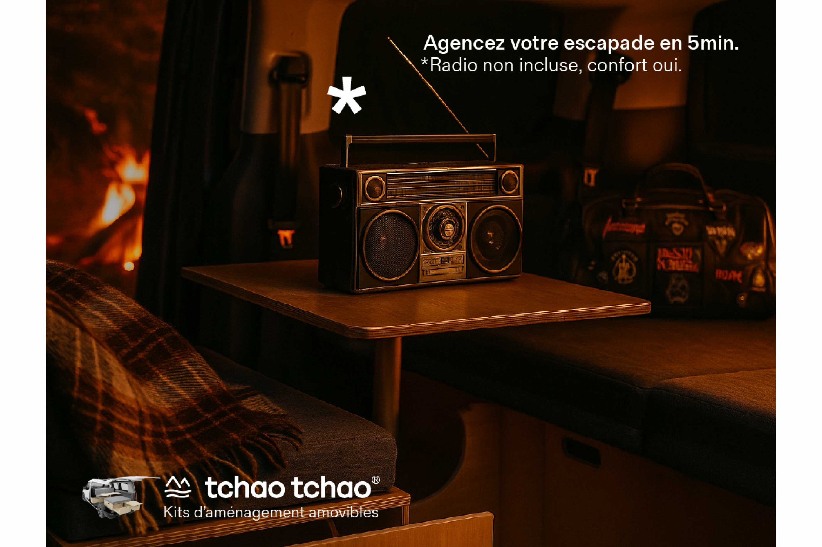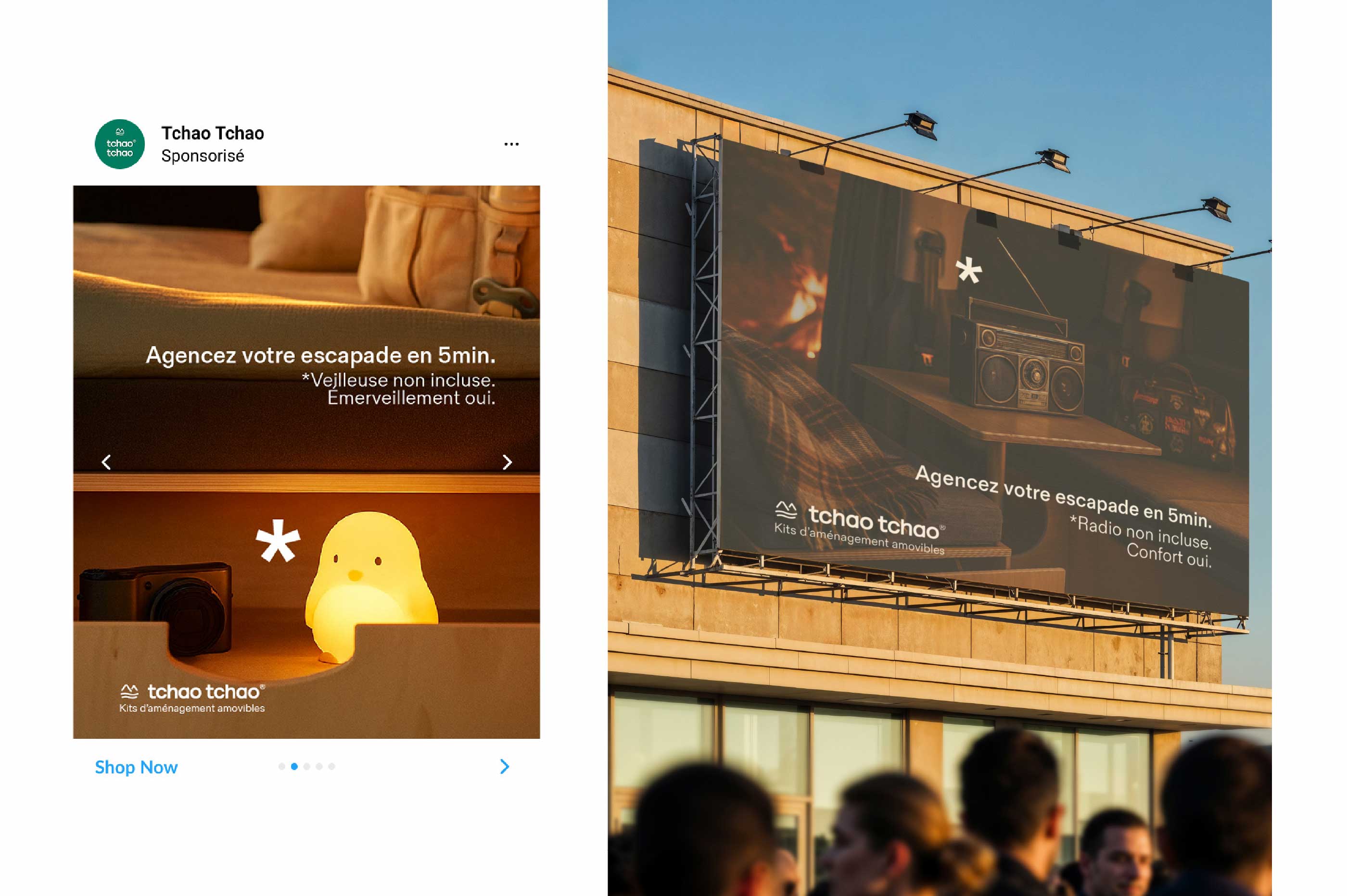 Dans le cadre d’un projet de publicité, j’ai réalisé une campagne pour Tchao Tchao, marque de kits d’aménagement de véhicules modulables, permettant de partir librement tout en retrouvant son “chez-soi”. Pensée en déclinaisons mettant en scène différents profils et situations de voyage, la campagne dépasse l’imaginaire vanlife et élargit la cible.